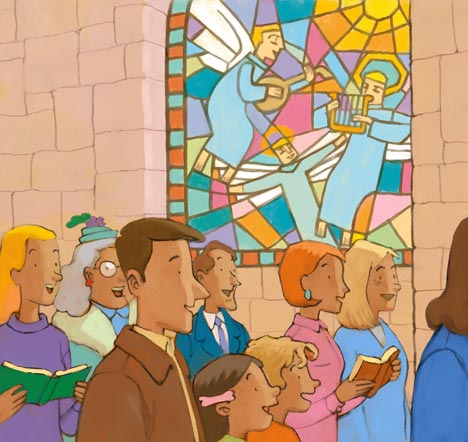 Expliquer -avec des mots simples et de grandes illustrations- le déroulé d'une messe dominicale: les paroles et gestes du prêtre et de toute l'assemblée.